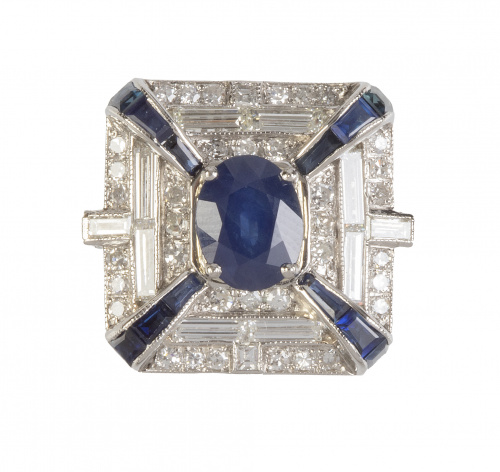 390. Sortija cuadrangular de zafiros y brillantes con zafiro oval central sobre marco cuadrado de brillantes y diamantes de talla baguette, con zafiros calibrados dispuestos en aspa