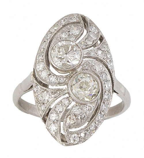 417. Sortija lanzadera estilo Art-Decó con dos centros que suman 1 ct rodeados por bandas sinuosas de brillantes