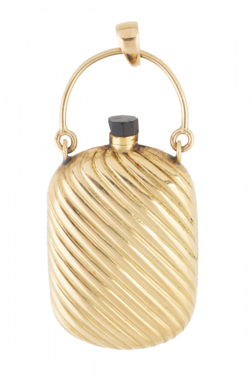 Botellita esenciero años 40 en oro con decoración gallonada oblícua y tapón de ónix factedo