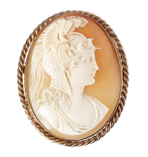 47. Broche camafeo S. XIX con perfil de Diosa Atenea tallado en concha bicolor