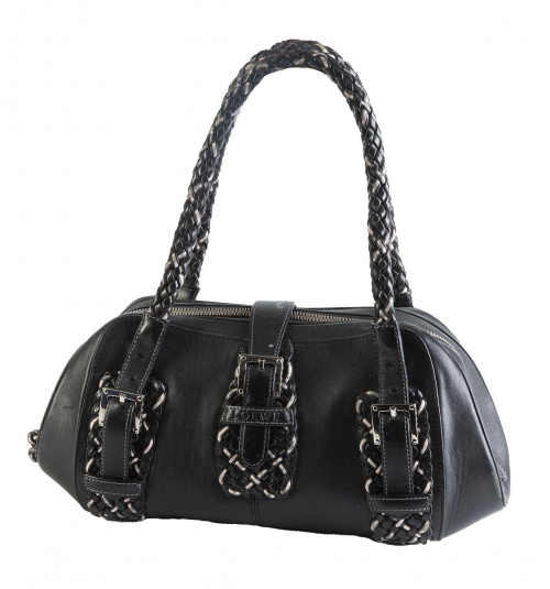 Con detalles en cuero trenzado negro y blanco en las asas y bajo decoracion de las hebillas y cierre