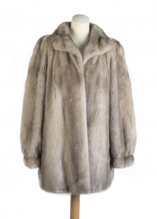 Abrigo corto de piel de visón color manteca grisáceo, con cuello de solapa pequeño, y mangas con puño