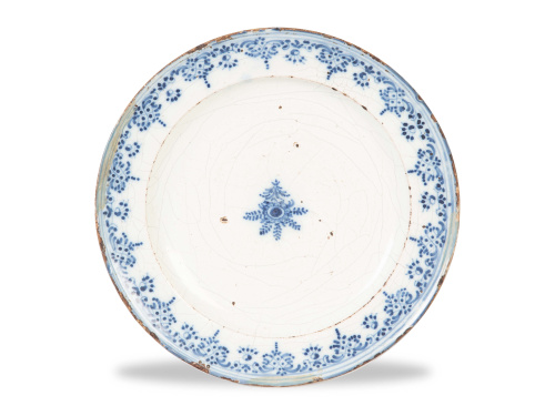 505. Plato de cerámica esmaltada en azul cobalto con decoración de puntilla "Berain".
