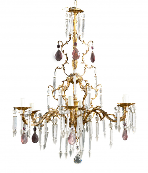 547. Lámpara con pandelocas en cristal transparente, cristal lila y bronce.