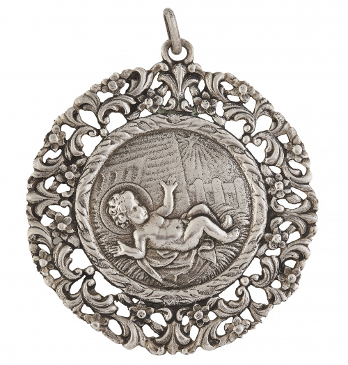 Medalla de cuna en plata con Niño Jesús rodeado por marco calado de formas vegetales