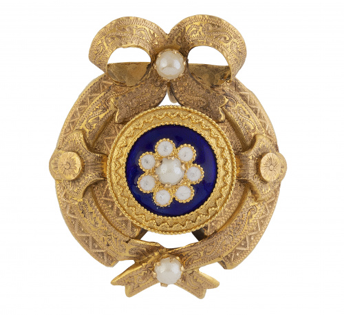 58. Broche colgante portugués S. XIX con diseño de cintas grabadas que rodean centro circular, con emalte azul