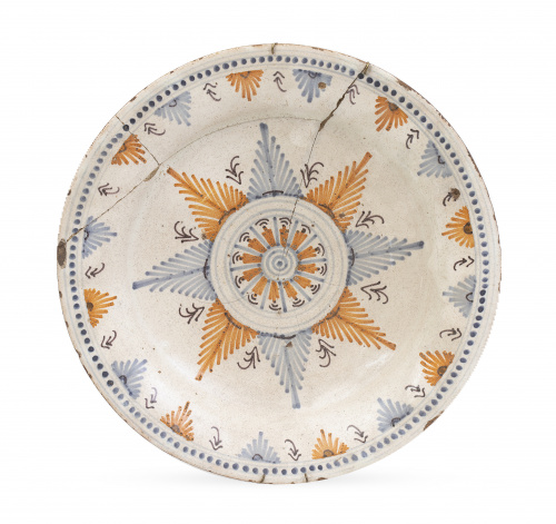 631. Plato de cerámica esmaltada de la serie de la Encomienda.