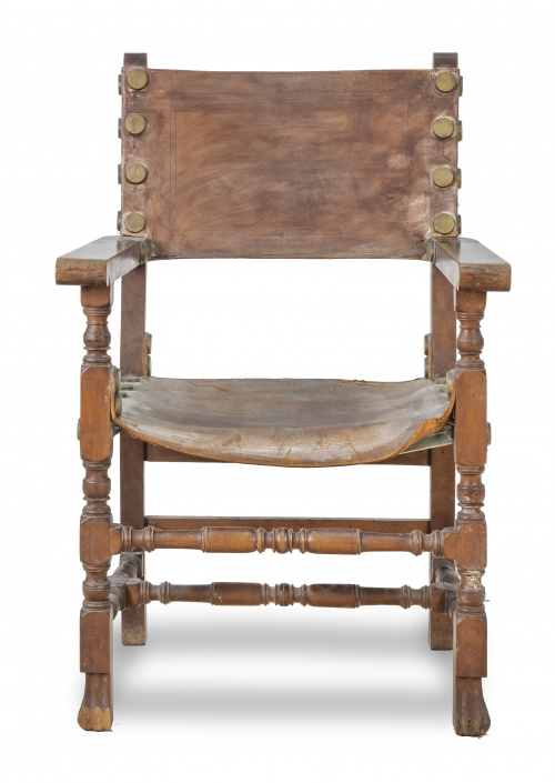 633. Sillón frailero de estilo Felipe V en madera torneada y piel tachonada.