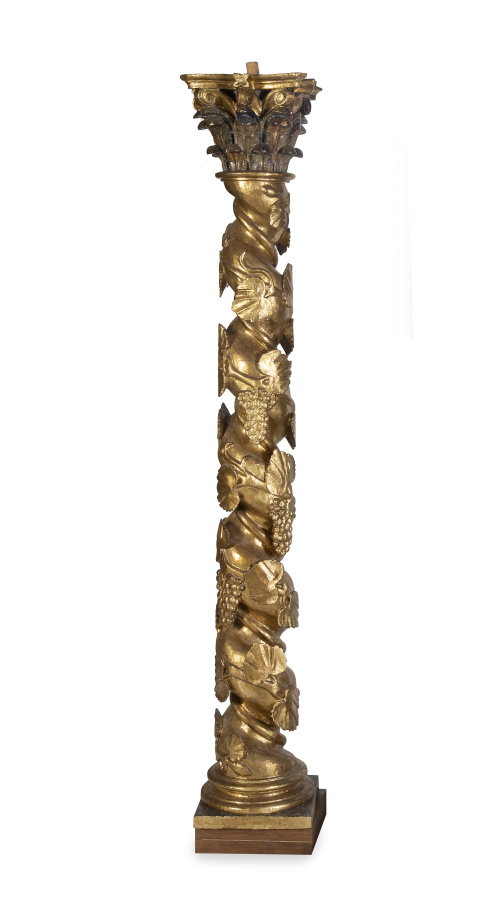 Columna salomónica de madera tallada y dorada y esgrafiada, con capitel de orden compuesto.