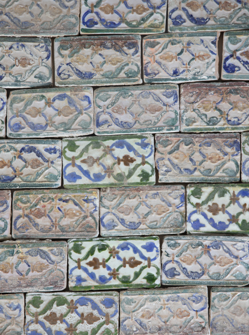 Conjunto de azulejos para zócalo de cerámica de "arista" esmaltados en verde, azul y ocre.