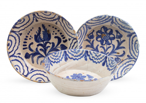 Lote de tres lebrillos de cerámica esmaltada en azul con motivos florales.