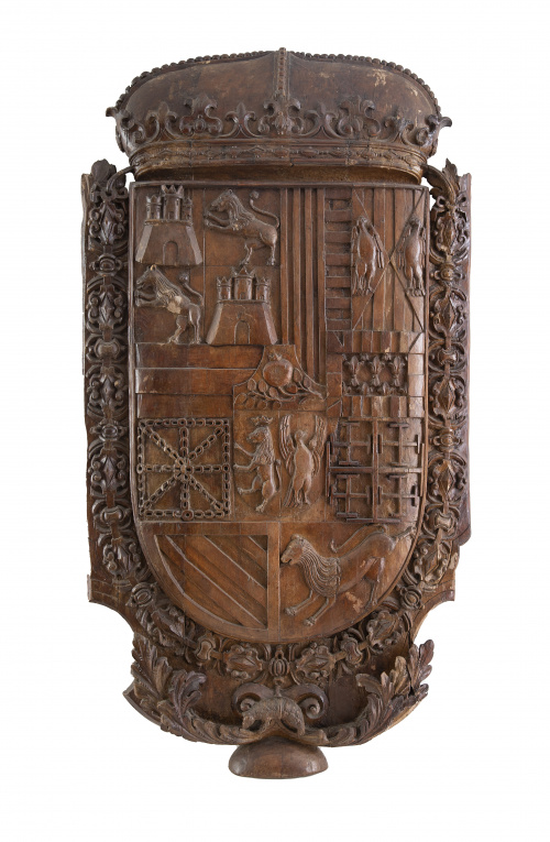 Presenta corona imperial en la parte superior y contorno decorado con la cadena del Toisón de Oro, con el cordero recostado sobre haces vegetales ornando la peana. El escudo no es muy diferente al de los monarcas anteriores pero introduce algún cambio en la distribución. En el primer registro de la mitad superior se encuentran los escudos de los reinos de Castilla y León, Aragón, Nápoles y Sicilia; mientras que en el segundo vemos los del archiducado de Austria, reino de Granada y ducado de Borgoña. En el registro inferior, en la parte izquierda aparecen los escudos del reino Navarra, condado de Flandes, condado del Tirol y en la derecha el de “Rey de Romanos”, título honorífico del antiguo reino de Jerusalén. En la base el condado de Borgoña y el ducado de Brabante.