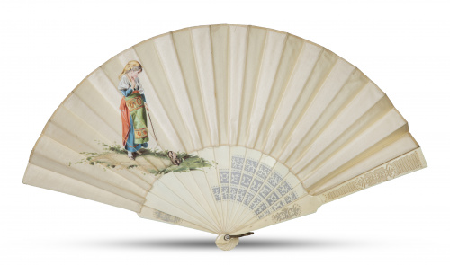 Abanico con varillaje de hueso con paisaje de tela pintada con mujer y violín.