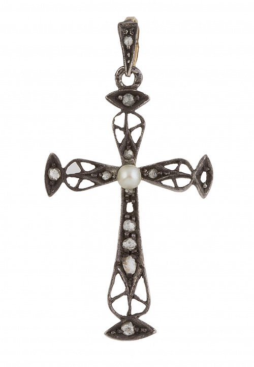 Delicada cruz colgante S. XIX con perlita central y diamantes en brazos con decoración calada