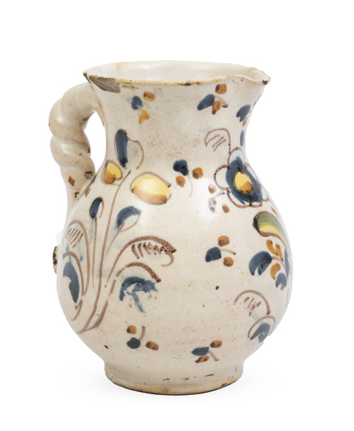Jarro de cerámica esmaltada con flores y asa sogueada.