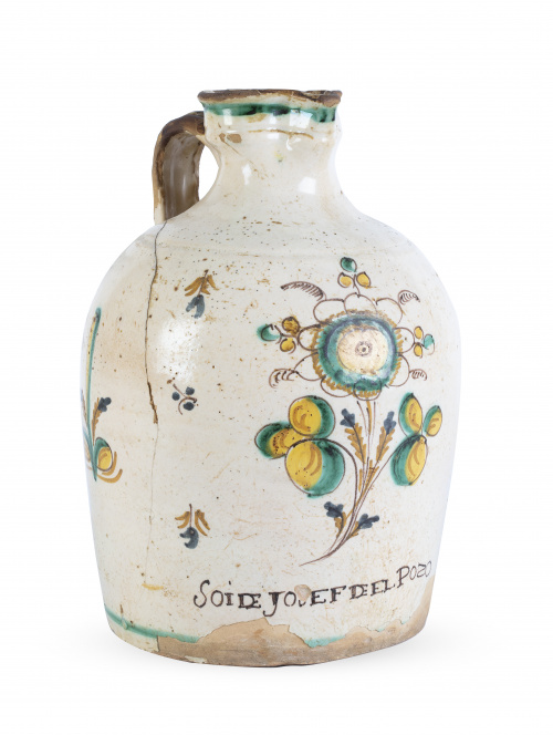 Aceitera Carlos IV de cerámica esmaltada con un ramillete decorativo y con el nombre del propietario “Soi de Yosef De El Pozo”