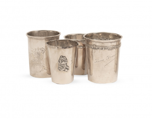 Lote de cuatro vasitos de diferente tamaño de plata grabada, dos con nombres "Juan Francisco" y "Eva".