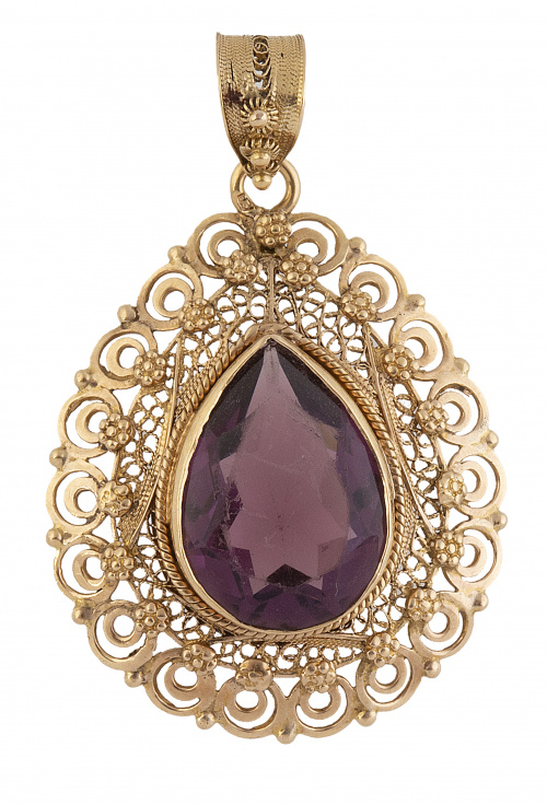 Colgante portugués de pp. S. XX con perilla de amatista en marco de filigrana de oro amarillo