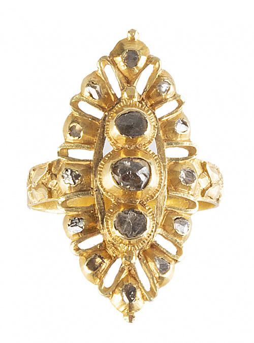 9. Sortija lanzadera S. SVIII-XIX de diamantes talla roca y anverso con decoración grabada