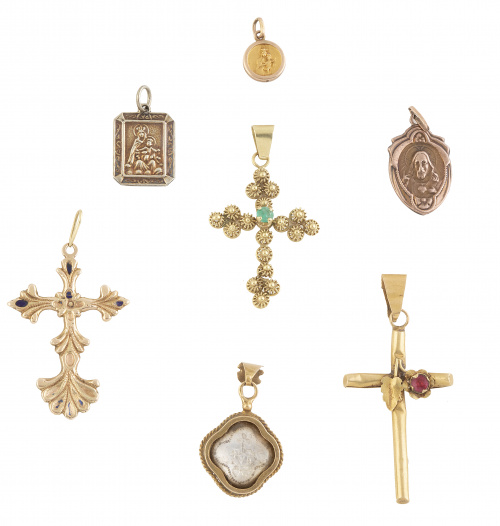 Lote de siete colgantes de pp. S. XX formado por tres cruces y cuatro medallas