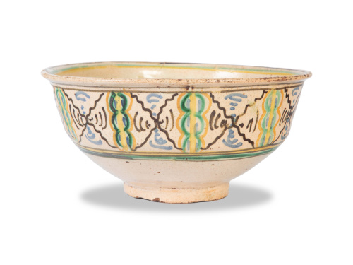 1081. Cuenco de cerámica esmaltada en azul, verde y ocre.