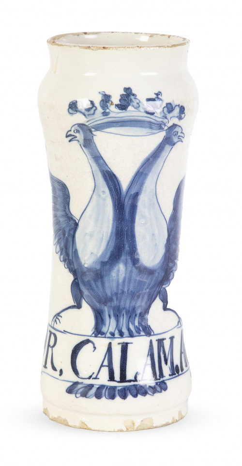 Bote de farmacia de cerámica esmaltada en azul de cobalto con águila bicéfala coronada e inscripción "R. Calam. AR".