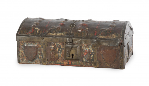 Cofre con alma de madera y tapa con forma de medio cañón, en piel labrada y policromada.