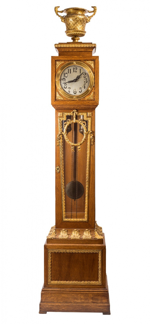 Reloj de caja alta de madera de roble y bronces aplicados.