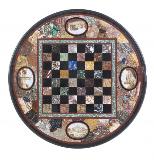 Tapa de mesa "specimen" con trabajo de piedras duras y micromosaico, con tablero de ajedrez y vistas de Roma.