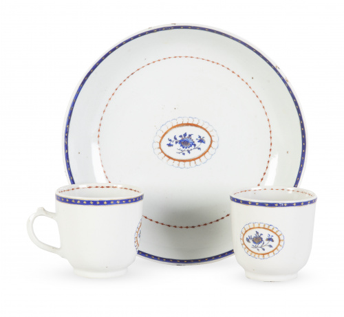 1218. Lote de plato acuencado y dos tazas de porcelana esmaltada.