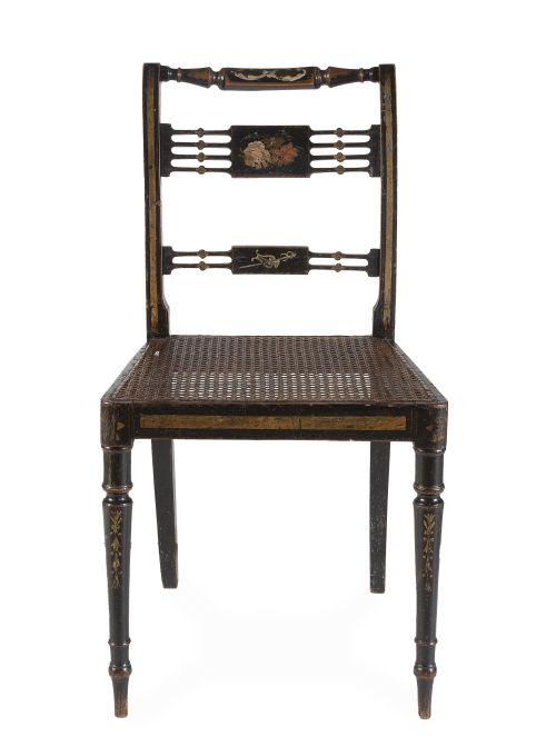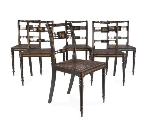 Juego de seis sillas Regency de madera lacada de negro, policromada y dorada, el asiento de enea.