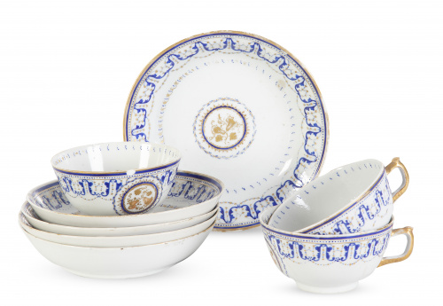 Juego de tres tazas y cinco platos de porcelana esmaltada y dorada.