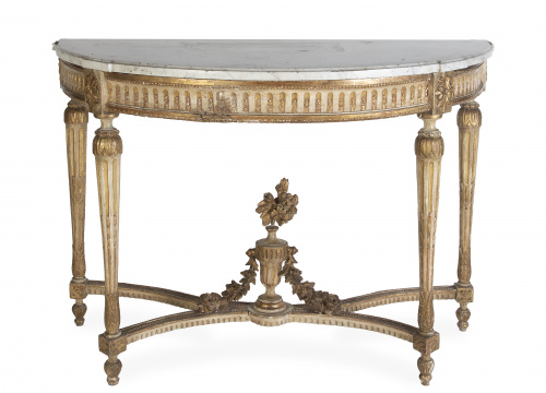 Consola de media luna en madera tallada y policromada con tapa de mármol blanco.
