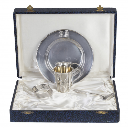Estuche con juego de plata y plata vermeille para bebé, con el escudo de la casa Real Española grabado.
