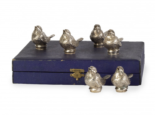 1247. Juego de seis saleros en forma de pajarito, con su estuche