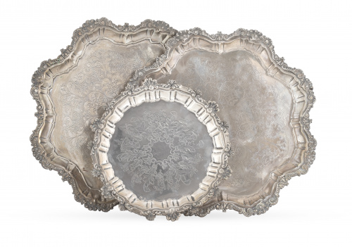 1248. Lote de tres salvillas de plata, de estilo inglés de diferentes tamaños.