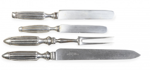 Lote de 2 cubiertos para trinchar, 6 cuchillos de carne y 2 de postre de plata.