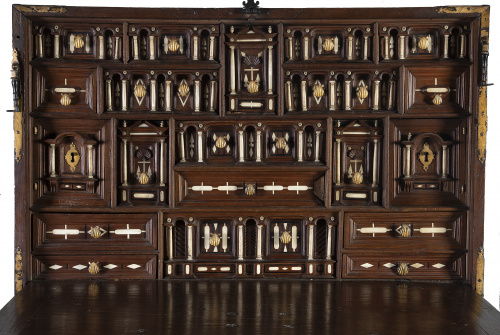 Bargueño en madera de nogal tallado, dorada y hueso.