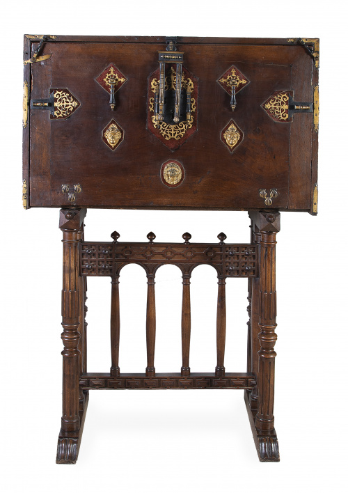 Sobre taquillón de pie abierto de época posterior. En el exterior hierro parcialmente dorado y recortado sobre soportes de terciopelo, con decoración de veneras, dos rostros y cabeza de león. interior arquitectónico con tiradores en forma de venera, arcos de medio punto, aplicaciones geométricas de hueso y columnilla de orden dórico. El cajón superior central y dos más con frontón partido.