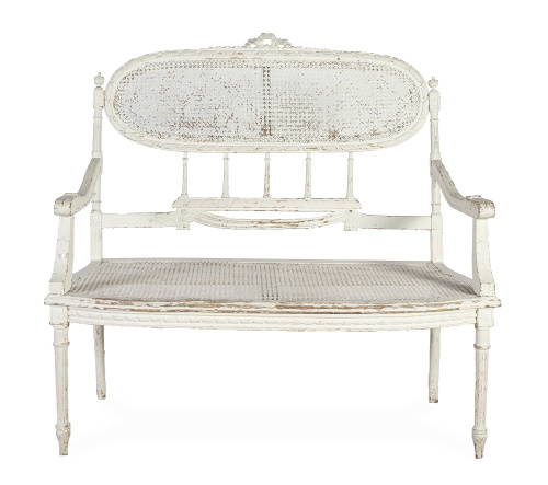 Banco de madera tallada y policromada de blanco con respaldo de enea.