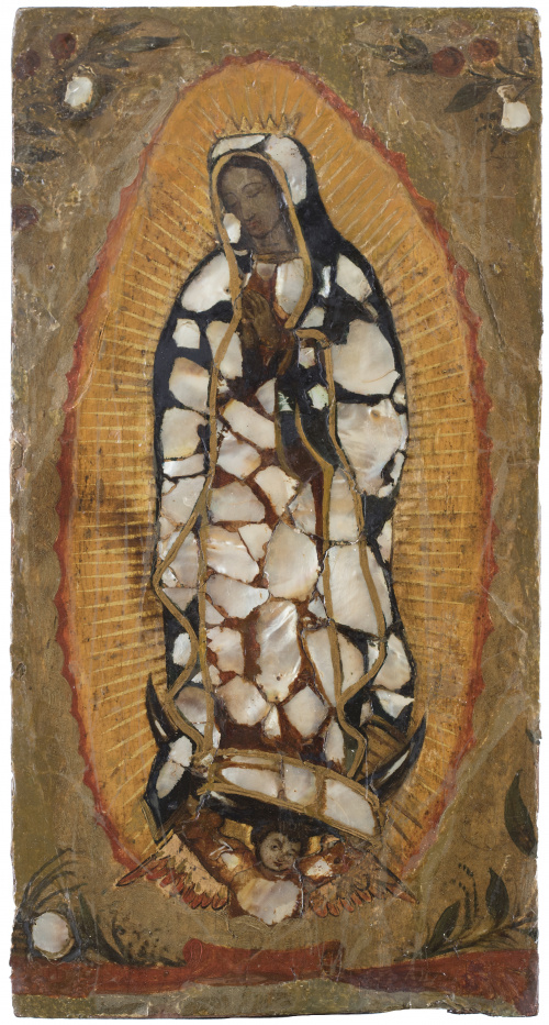 Son pocos los ejemplos de enconchados de la Virgen de Guadalupe conservados, uno en la colección Frans Mayer, otro en el Museo de Pedro de Osma y por último en el Museo Nacional del Prado.