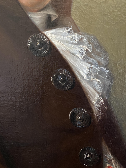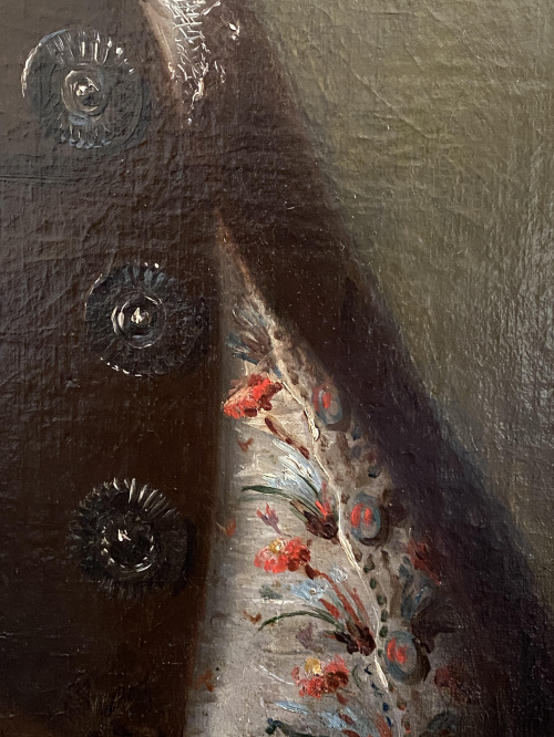 Bajo la casaca se aprecia el chaleco de seda blanca valenciana con motivos florales de clavelinas bordados, que están ejecutados con gran soltura de pincel en tonos carmines, verdes, azules y marrones. El efecto del mismo resulta una auténtica delicia visual. Chalecos de seda blanca con estampados o bordados de flores encontramos en otro retratos de ese momento, como el que Maella pintó del cosmógrafo mayor de Indias, el valenciano Juan Bautista Muñoz, en 1793, de colección particular española, estudiado por José Manuel de la Mano, en el retrato que Goya le hiciera a Ramón de Posada, con flores ya de ejecución preimpresionista, o en el último Autorretrato inacabado del propio Francisco Bayeu de la Real Academia de B.A. de San Fernando, que hay que datar, como ya propuse en 2012, en el otoño de 1794.