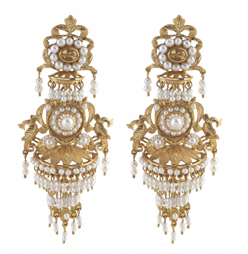Pendientes largos de fallera valencianos con tres cuerpos articulados cuajados de perlas con motivos vegetales de oro labrado