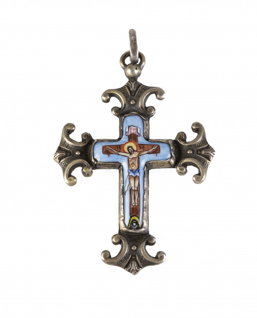 Cruz colgante rusa de plata y esmalte probablemente Rostov pp. S. XX en plata punzonada
