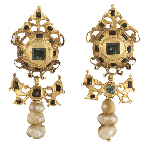 Home / SUBASTA MARZO 2023 / Pendientes largos populares S. XVIII-XIX con esmeraldas, en