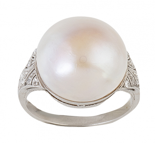 115. Sortija c. 1920 con media perla abotonada de gran tamaño, y montura decorada con brillantes y decoración calada