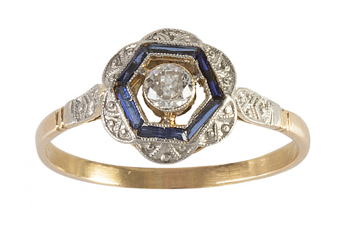 118. Sortija ojo de perdiz Art-Decó con brillante y marco de flor de brillantes y zafiros calibrados
