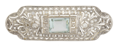 129. Broche placa Art-Decó con aguamarina talla esmeralda central, en decoración geométrica calada y cuajada de diamantes