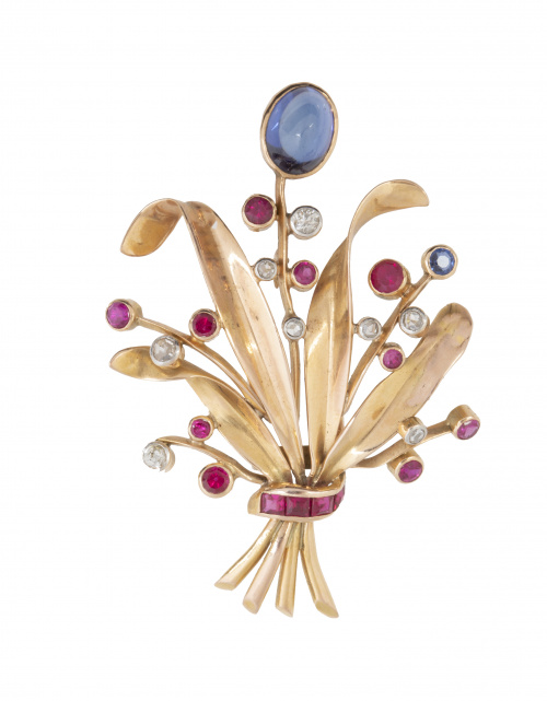 Broche años 40 con diseño de ramo decorado con zafiros, brillante, diamantes y rubíes sintéticos