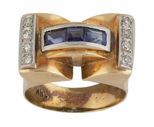 Sortija chevalier años 40 con arco central de zafiros calibrados entre bandas de brillantes en diseño simétrico